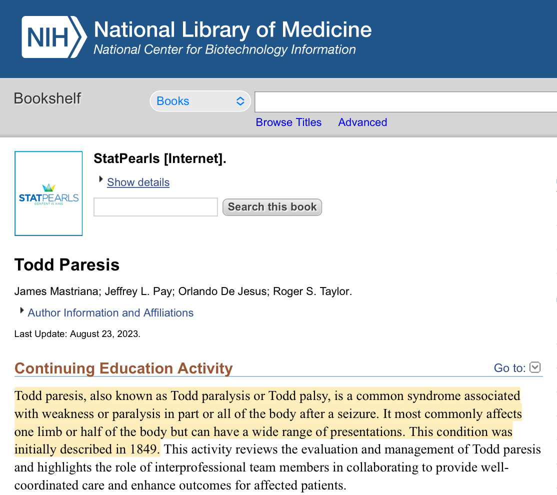 I will also try to get the records from MGH to see if they made the diagnosis of Todd paresis on just the clinical history the way I am now considering, years later. A diagnosis made, lost and rediscovered?