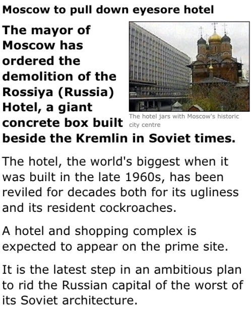 (Writing this piece, I came across the news item that the Hotel Rossiya, once the biggest hotel in the world, was demolished in 2006.)