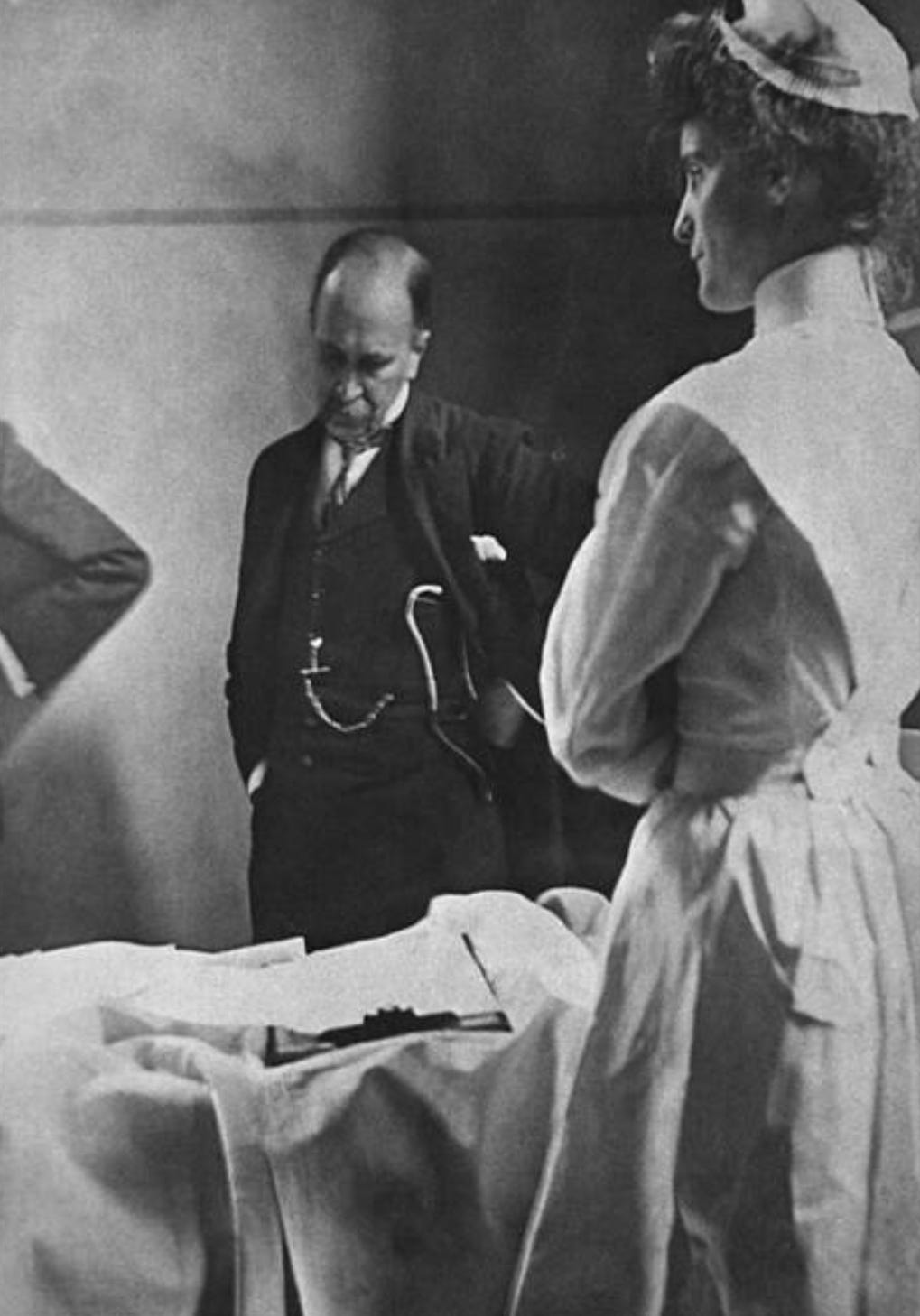 I have a new picture, not yet framed. It is a black and white photograph of Sir William Osler teaching at a patient’s bedside. He is wearing a three-piece suit with a watch chain and a stethoscope. If I can’t find a real-live mentor, I may find myself imagining for a while that Sir William is looking over my shoulder.