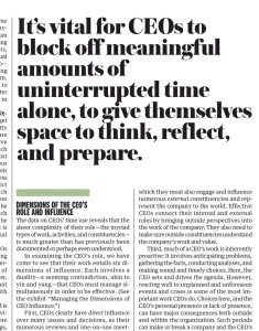 I was also intrigued by the statistic that 61% of CEOs’ time is spent face to face and 24% on electronic communication. Only an unspecified fraction of 15% is spent on reading written reports.
