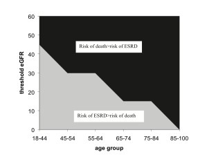 “I have been a doctor since 1979 and I can count on one hand the patients I have cared for that ended up on dialysis or dying from kidney failure. Look at this graph”, I said and pointed to the latest addition to my bulletin board. “You’re 74, and your GFR is 54. This graph shows that at your age, your GFR would have to be somewhere around 15 to make you more likely to die from kidney failure than something else.