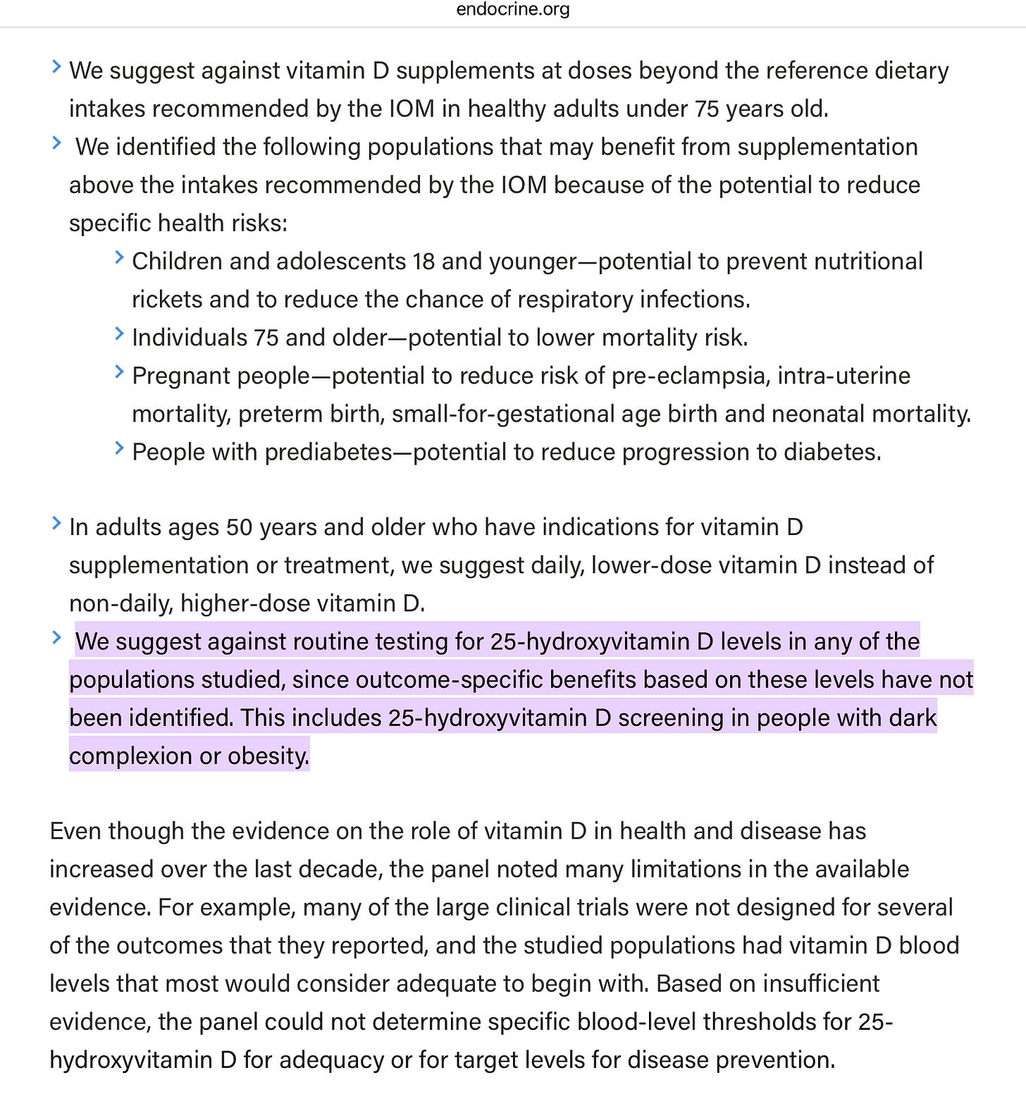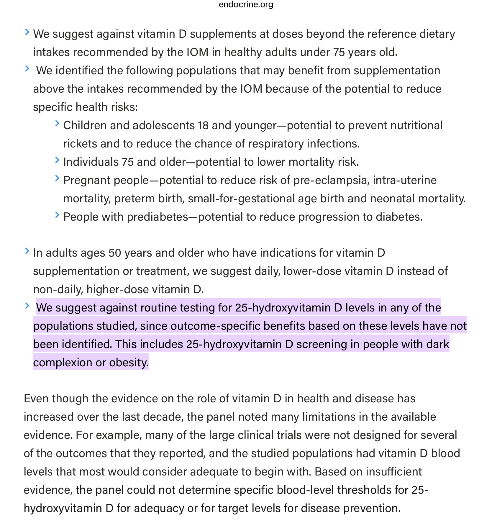 Vitamin D is back in the news. It has been one of my pet peeves over the years. We know what the average levels are, but we still don’t know if low or high levels mean anything for people without osteoporosis. Most insurance companies don’t pay for screening and now the Endocrine Society has officially advised against screening people under 75 without osteoporosis for vitamin D deficiency.
