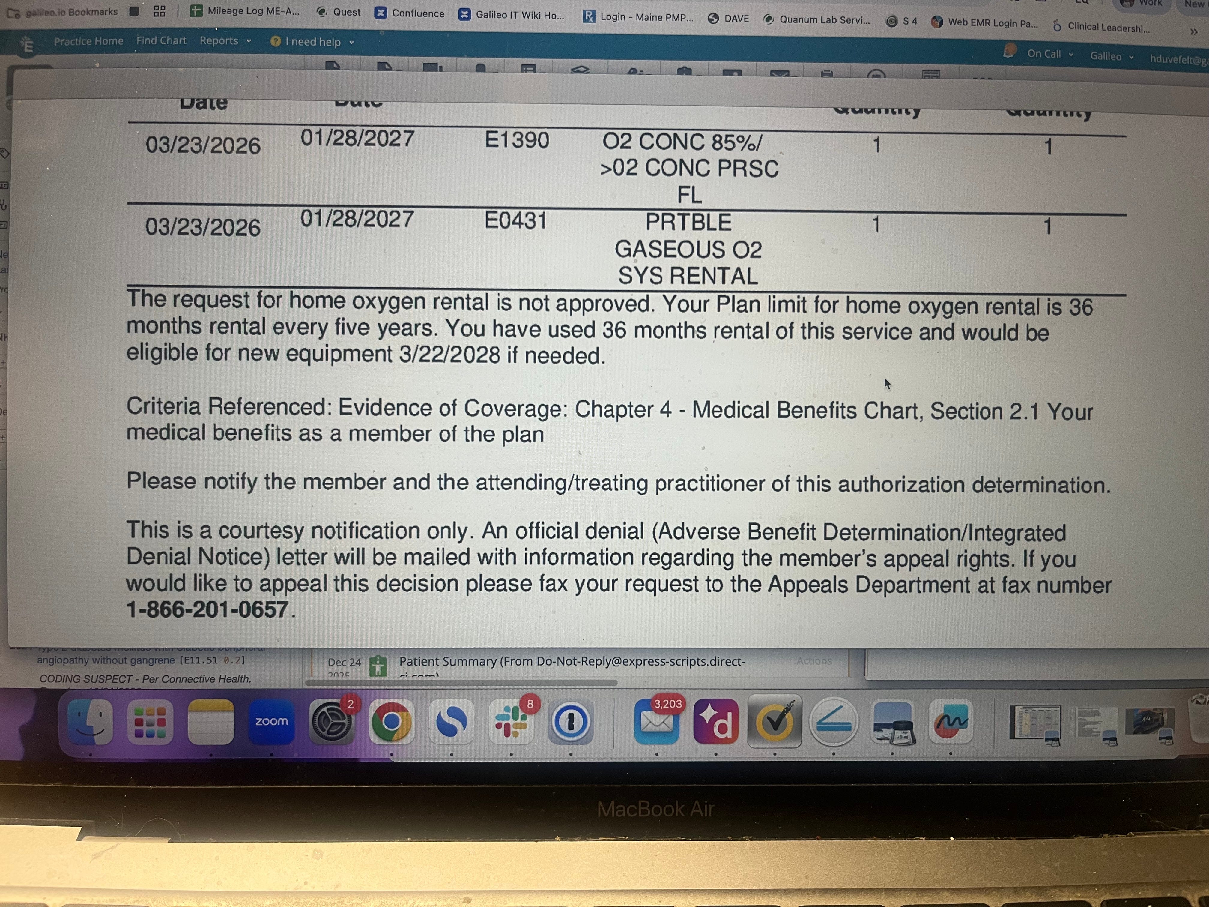 I got an ominous looking fax in my electronic inbox today. WellCare was notifying me that my oxygen dependent COPD patient’s concentrator rental was going to be terminated because her “plan limit for home oxygen rental is 36 months. You have used 36 months rental of this service and would be eligible for new equipment 3/22/28 if needed”.