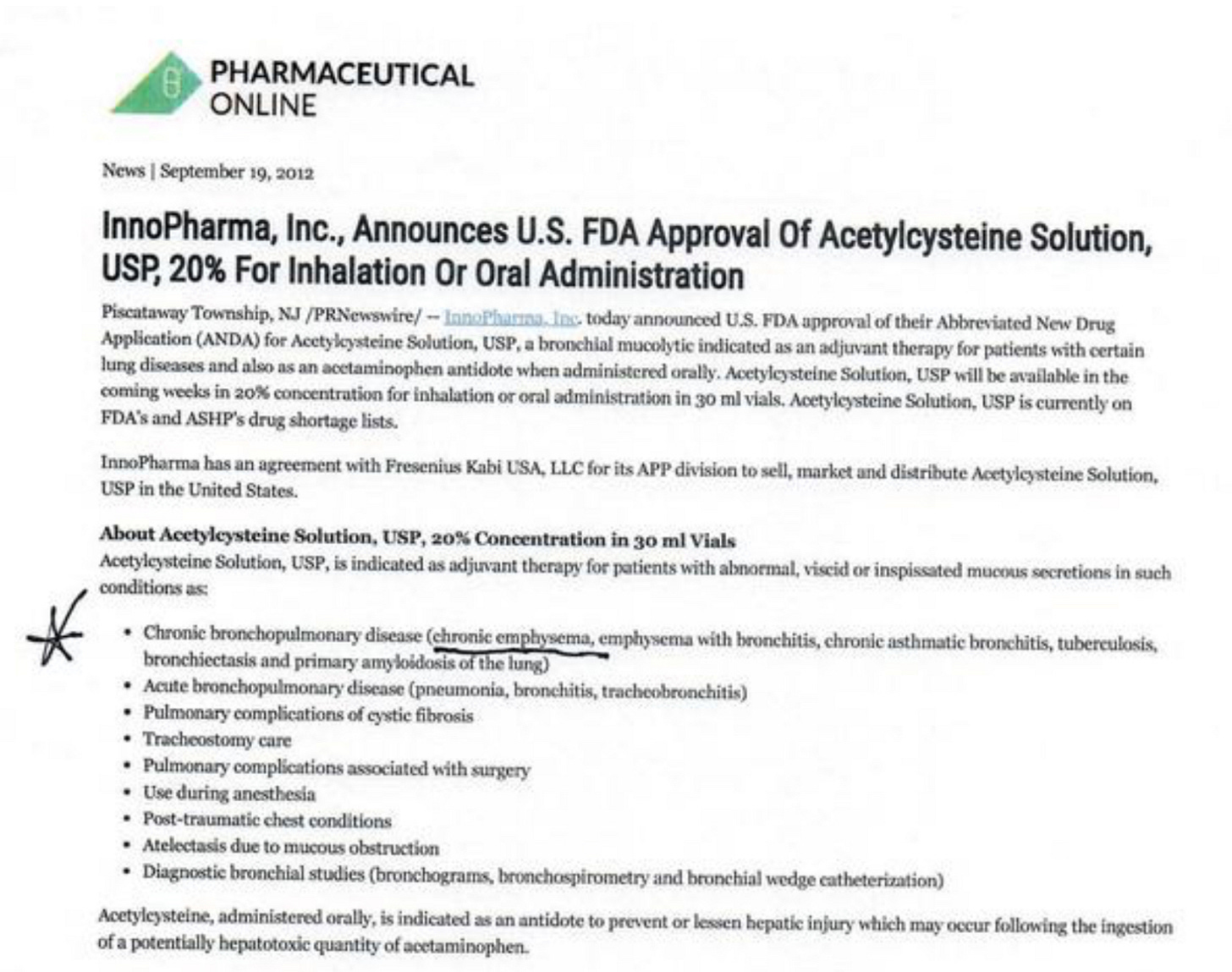 I have a patient with severe lung disease who is on oxygen 24/7. She had been using high doses of guaifenesin, but still couldn’t raise her phlegm. I haven’t used it in many years but remembered from the early days of my career that acetylcysteine is a powerful mucolytic.