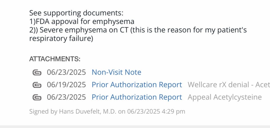 It’s used in the hospital more often than in outpatient care. So I called the patient’s pharmacy and they don’t have it in stock, but they can get it and my insurance would require a prior authorization. So I sent in a prior auth request with the diagnosis of chronic respiratory failure with hypoxemia. My application was denied. It said that the diagnosis I gave them was not a qualifying diagnosis. They were kind enough to reference a website I could go to to see what might qualify. So I did. There, I saw that emphysema qualifies. Well, darn it, She has had a CAT scan of her lungs showing severe emphysema, but in my book respiratory failure with low oxygen is a more severe diagnosis than emphysema. This is one instance where I sort of wish that AI would be used. The insurance companies deny requests because there’s no common sense in the process. They have check boxes. Emphysema would be a check and respiratory failure with low oxygen would not be a check.
