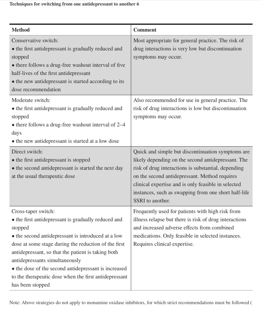 In my experience, this is almost never necessary. Think about it, the SSRIs hit the same receptors. Each drug has a somewhat different personality; some are sedating, some a little energizing and so on. You would also have to consider the half life, like fluoxetine (Prozac) has a long one and venlafaxine (Effexor) a short one. Switching between a long acting and a short acting one may require a wait period or a partial taper. But the main action is similar enough that tapering completely off one and on to another is more likely to cause unpleasant reactions (SSRI withdrawal) than a straight one-day switch. I do the same when switching from an SSRI to an SNRI like venlafaxine or duloxetine. I just ballpark the SSRI potency of the two drugs and, wham, we’re done.