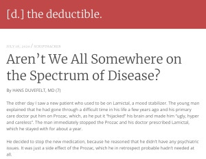 I am torn about using labels that may not fit exactly. They can help as concepts, but can also predispose patients to magnifying their illness experience and thus be self-fulfilling prophecies. I tend toward the concept of shadow syndromes and disease spectrums. (The screenshot below is from a now defunct blog by the former editor of The Health Care Blog, where Aren’t We All Somewhere on the Spectrum of Disease was published before it appeared on my own blog.)